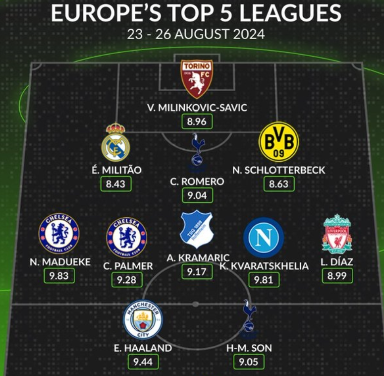 축구 통계 매체 '후스코어드닷컴'은 27일(한국시간) 유럽 5대리그에서 뛰는 선수들 중 23일부터 26일까지 열린 경기에서 가장 뛰어난 활약을 펼친 11명의 선수들을 모아 베스트 일레븐을 구성했다. 최전방에는 맨체스터 시티의 괴물 공격수 엘링 홀란과 에버턴전 멀티골의 주인공 손흥민이 뽑혔다. 홀란은 2라운드에서 해트트릭을, 손흥민은 두 골을 집어넣으며 시즌 초반부터 뜨거운 득점왕 경쟁을 시작했다.