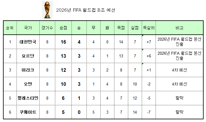대한민국은 3차 예선에서 B조에 속해 있으며, 남은 경기 일정은 다음과 같습니다: