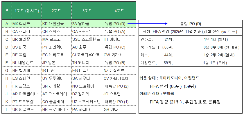 유럽 PO D조에는 덴마크, 북마케도니아, 아일랜드, 체코가 포함되어 있습니다.